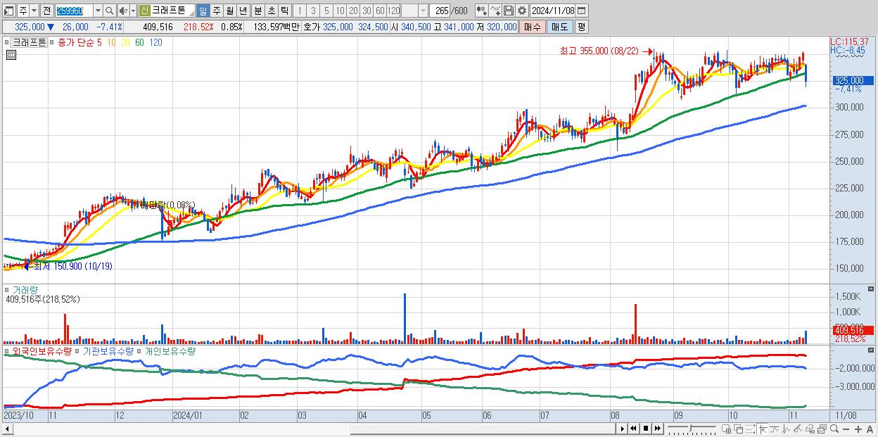 - 크래프톤 (325,000원 ▼ -7.41% , 시총: 155,675억, 거래량: 407,582, 거래대금:1,330억)