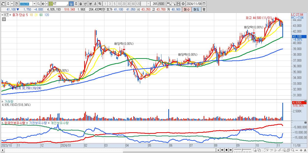 - KT (41,100원 ▼ -4.08% , 시총: 103,581억, 거래량: 4,166,942, 거래대금:1,727억)