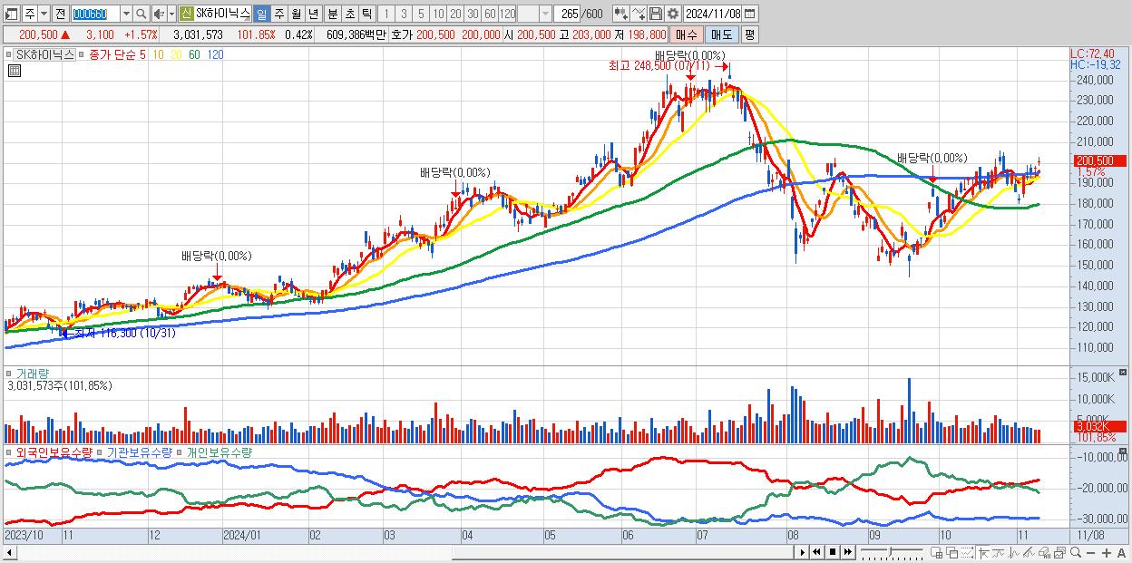- SK하이닉스 (200,500원 ▲ 1.57% , 시총: 1,459,645억, 거래량: 2,994,113, 거래대금:6,018억)