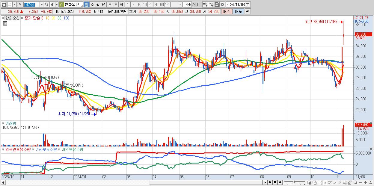 - 한화오션 (36,200원 ▲ 6.94% , 시총: 110,922억, 거래량: 16,411,192, 거래대금:5,889억)