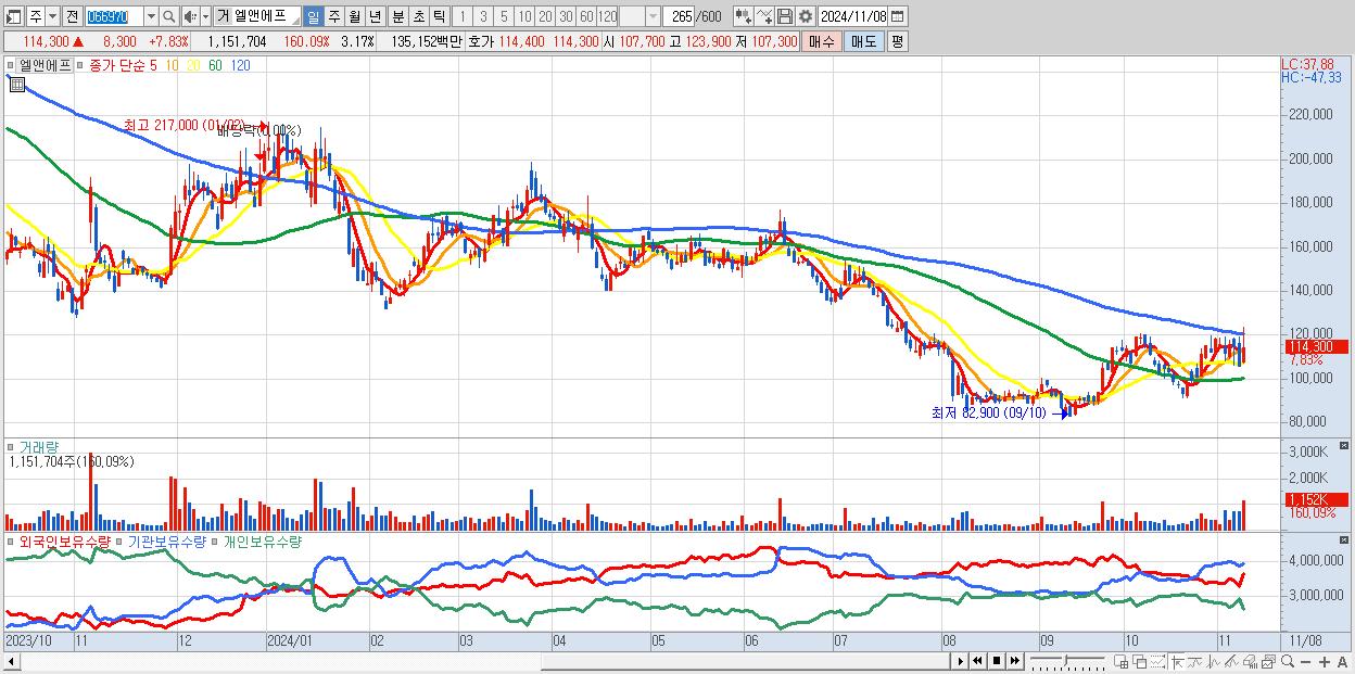 - 엘앤에프 (114,300원 ▲ 7.83% , 시총: 41,487억, 거래량: 1,145,454, 거래대금:1,344억)