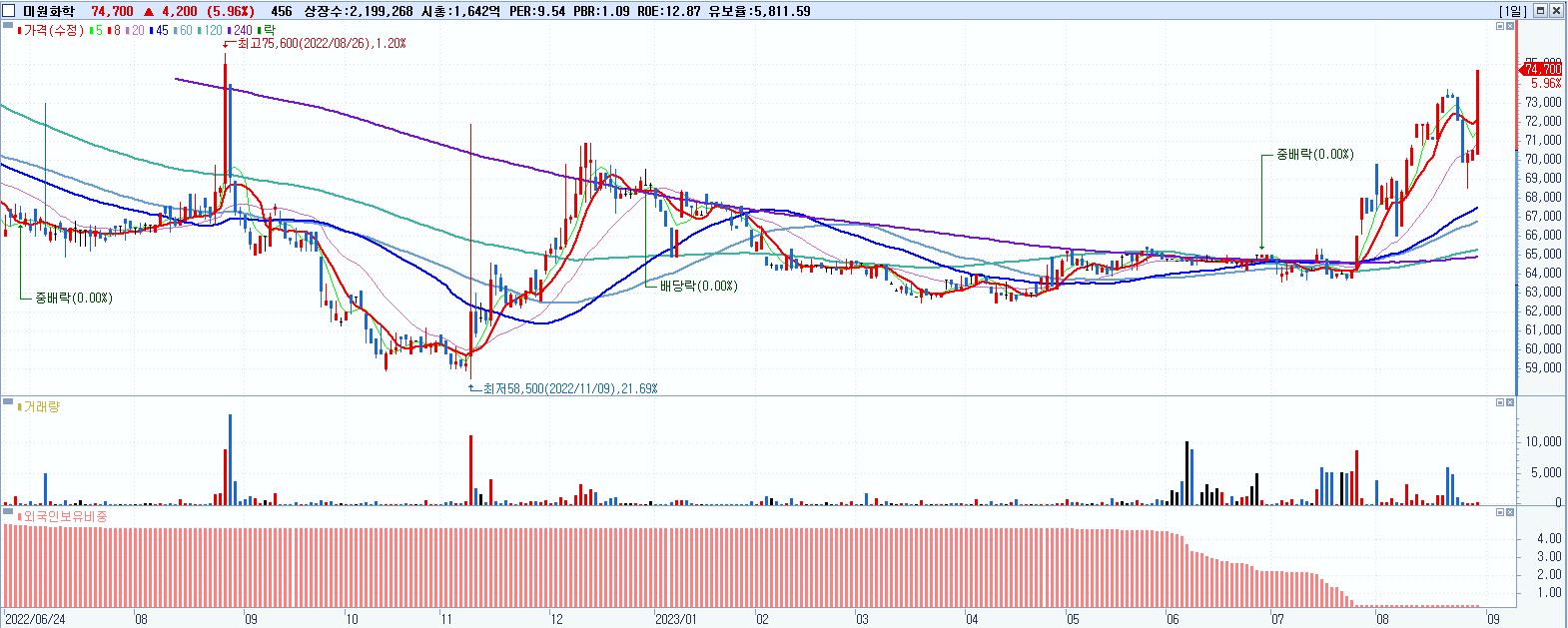 - 미원화학 (74,700원 ▲ 5.96% , 시총: 1,643억, 거래량: 458, 거래대금:0억, KOSPI)