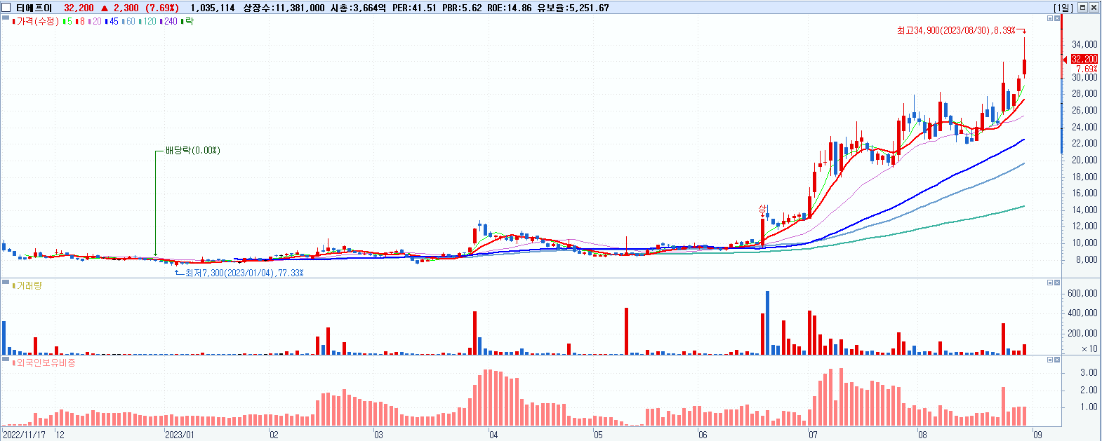 - 티에프이 (32,200원 ▲ 7.69% , 시총: 3,665억, 거래량: 1,041,644, 거래대금:345억, KOSDAQ)