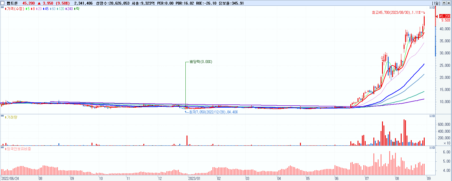 - 펩트론 (45,200원 ▲ 9.58% , 시총: 9,323억, 거래량: 2,395,497, 거래대금:1,049억, KOSDAQ)