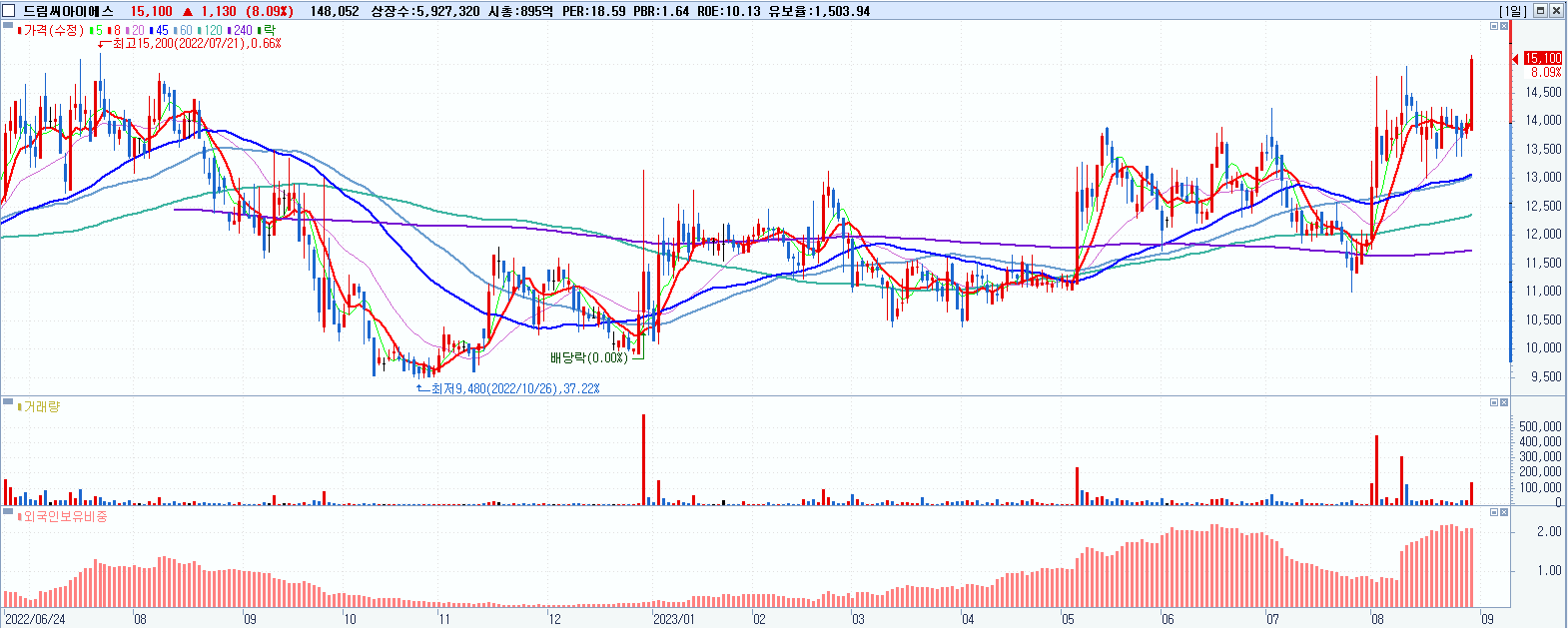 - 드림씨아이에스 (15,100원 ▲ 8.09% , 시총: 895억, 거래량: 149,451, 거래대금:22억, KOSDAQ)