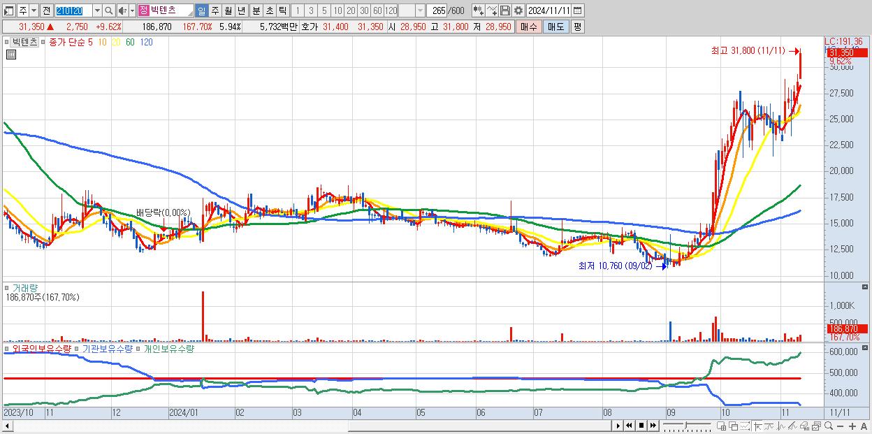 - 빅텐츠 (31,350원 ▲ 9.62% , 시총: 986억, 거래량: 186,870, 거래대금:57억, KOSDAQ)