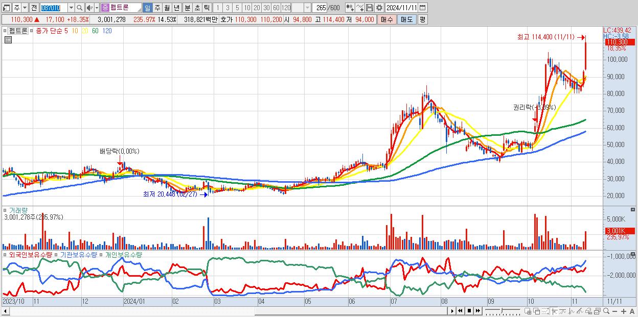 - 펩트론 (110,300원 ▲ 18.35% , 시총: 22,785억, 거래량: 3,001,278, 거래대금:3,188억, KOSDAQ)