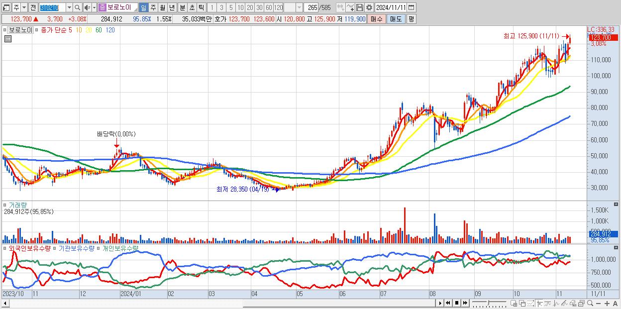 - 보로노이 (123,700원 ▲ 3.08% , 시총: 22,707억, 거래량: 284,912, 거래대금:350억, KOSDAQ)