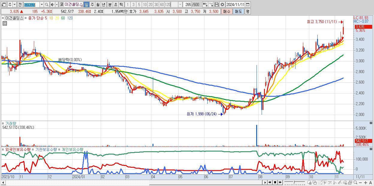 - 이건홀딩스 (3,635원 ▲ 5.36% , 시총: 821억, 거래량: 542,517, 거래대금:20억, KOSDAQ)