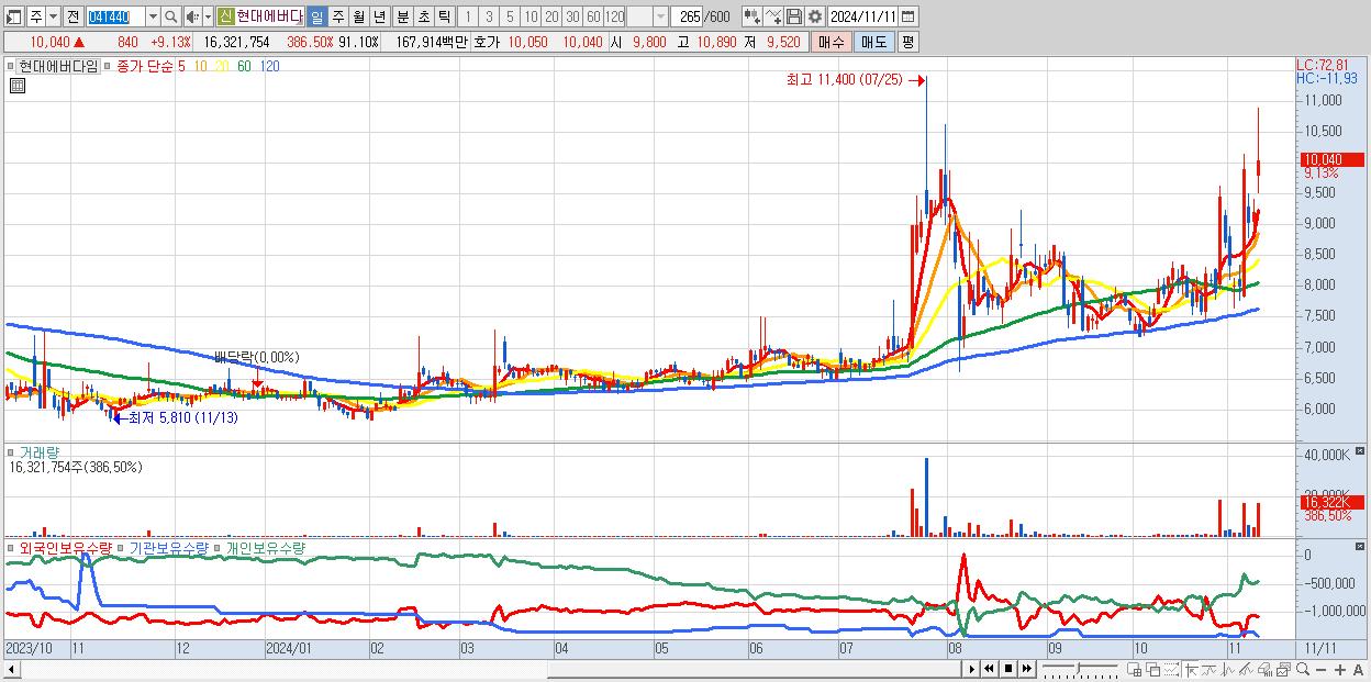 - 현대에버다임 (10,040원 ▲ 9.13% , 시총: 1,799억, 거래량: 16,321,754, 거래대금:1,679억)