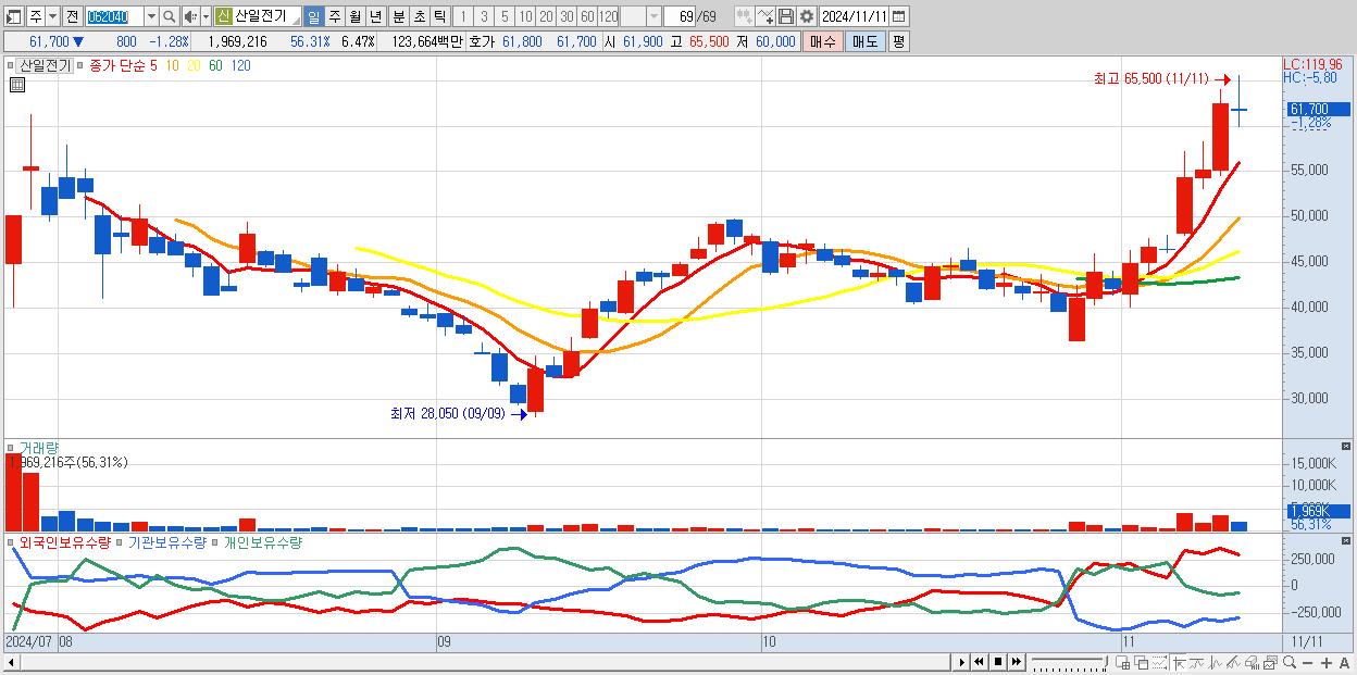 - 산일전기 (61,700원 ▼ -1.28% , 시총: 18,785억, 거래량: 1,969,216, 거래대금:1,237억)