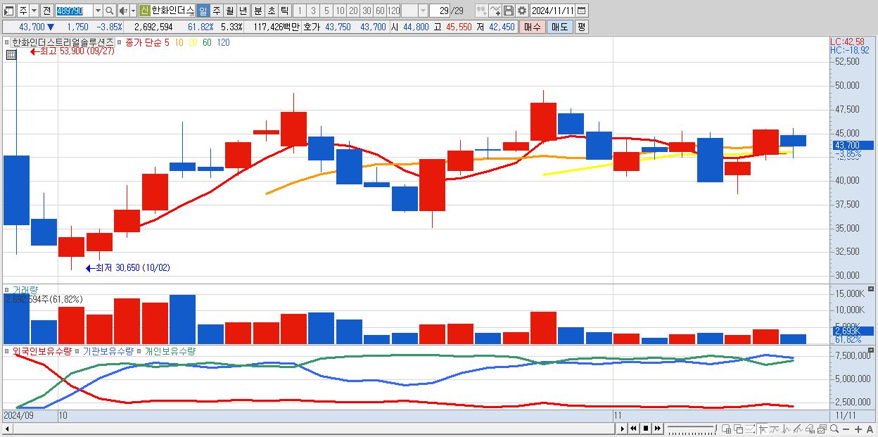30.한화인더스트리얼솔루션즈 43,700원 ▼ -3.85% (KOSPI, 489790)