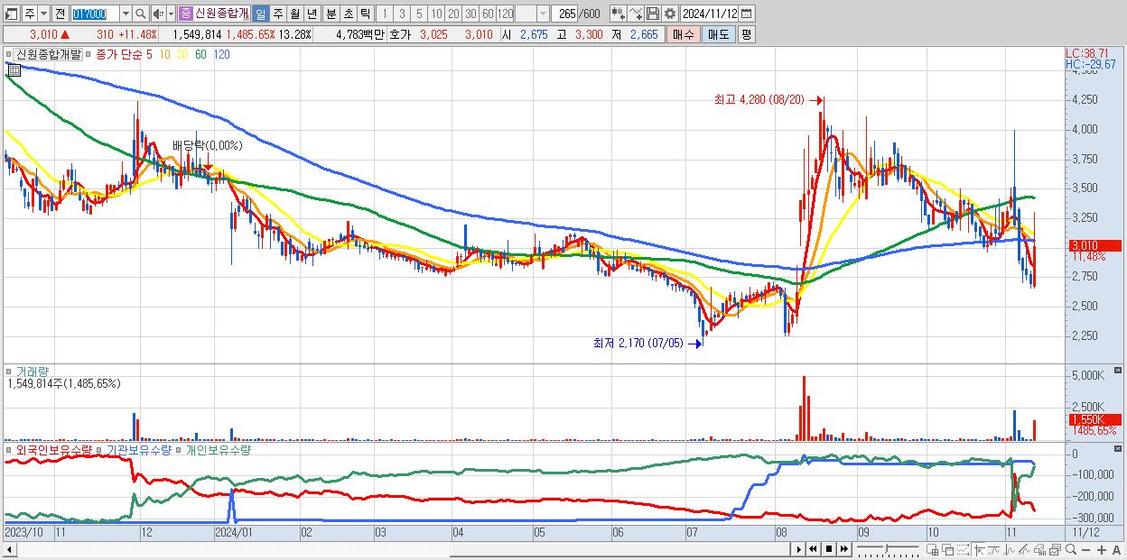 - 신원종합개발 (3,010원 ▲ 11.48% , 시총: 351억, 거래량: 1,549,814, 거래대금:48억)