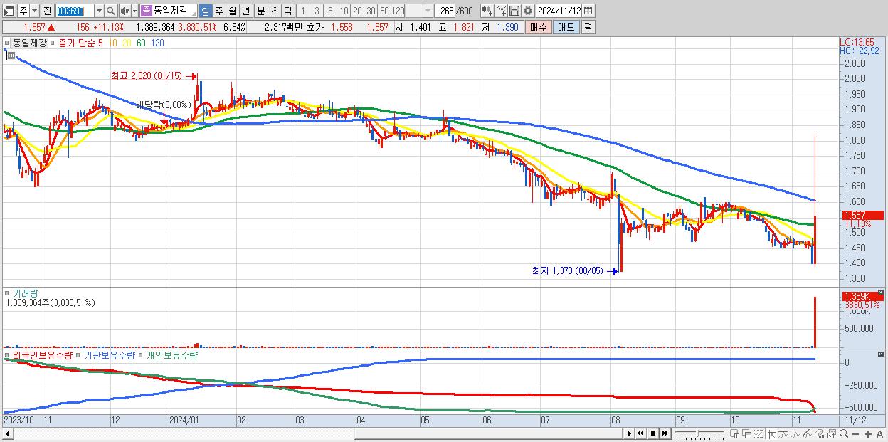 - 동일제강 (1,557원 ▲ 11.13% , 시총: 316억, 거래량: 1,389,364, 거래대금:23억)
