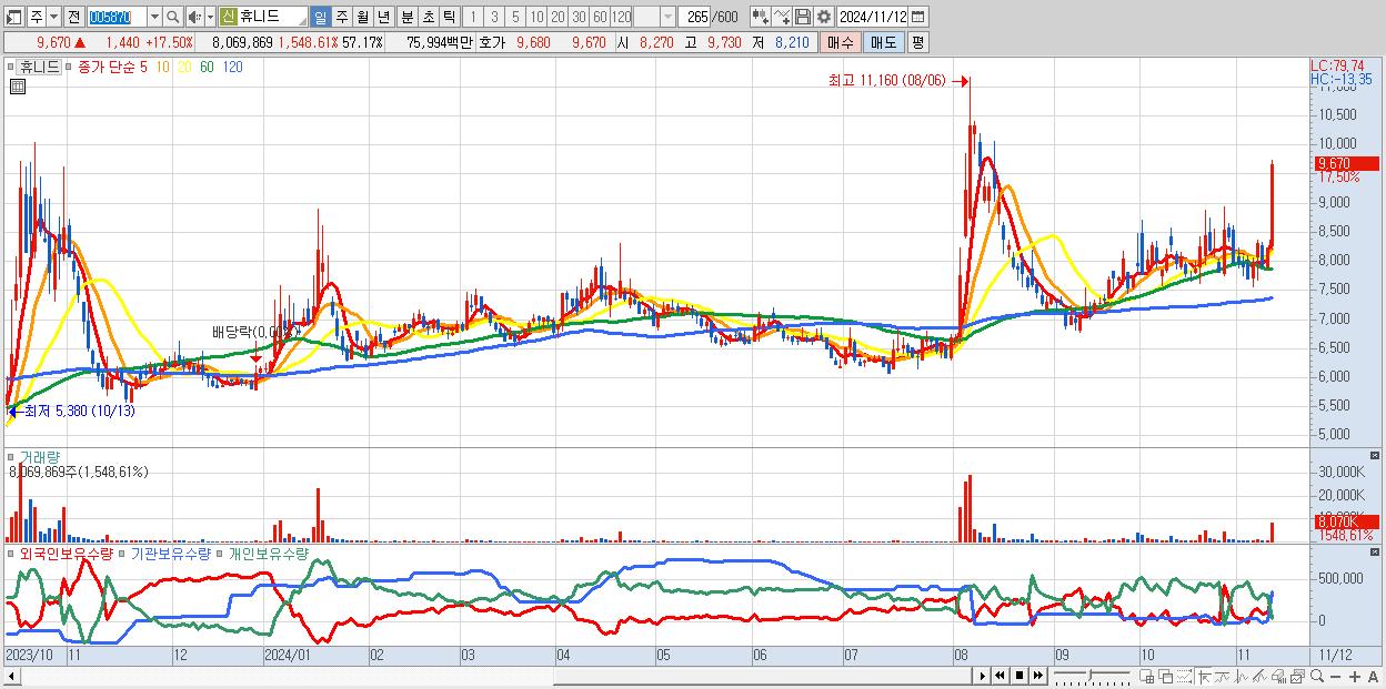 - 휴니드 (9,670원 ▲ 17.5% , 시총: 1,365억, 거래량: 8,069,869, 거래대금:760억)