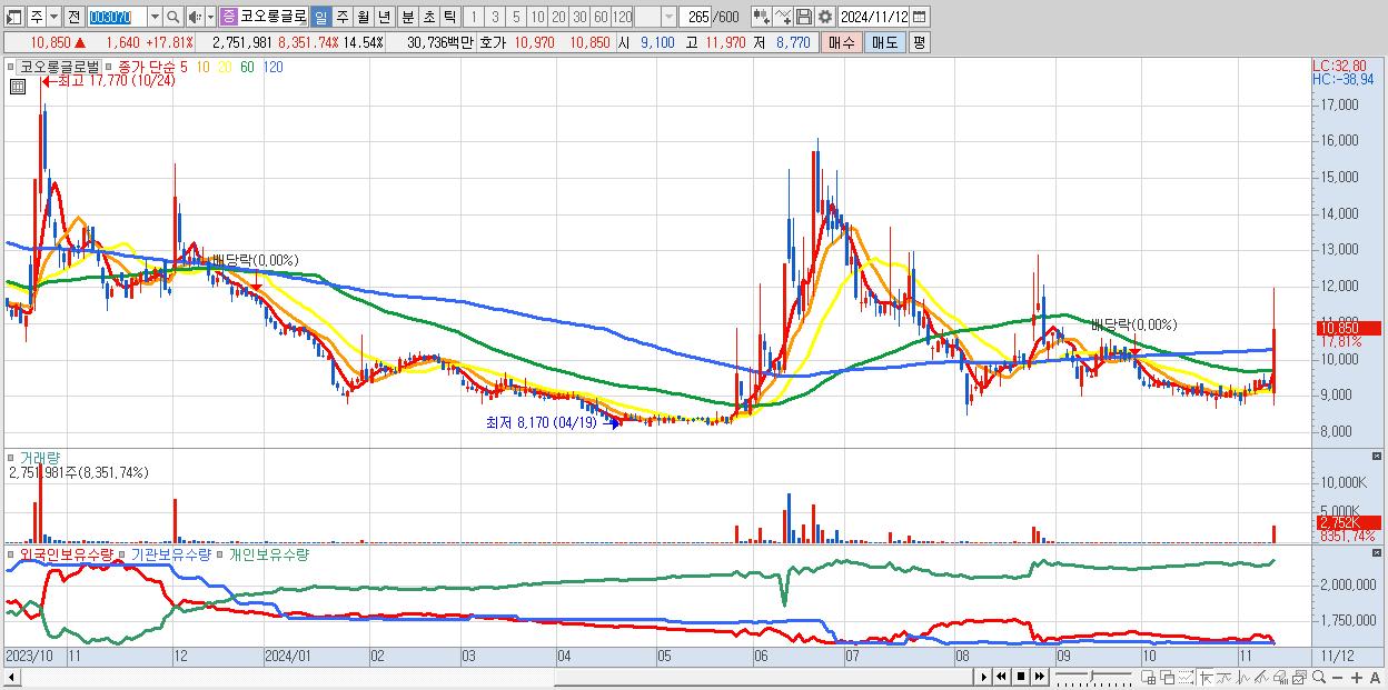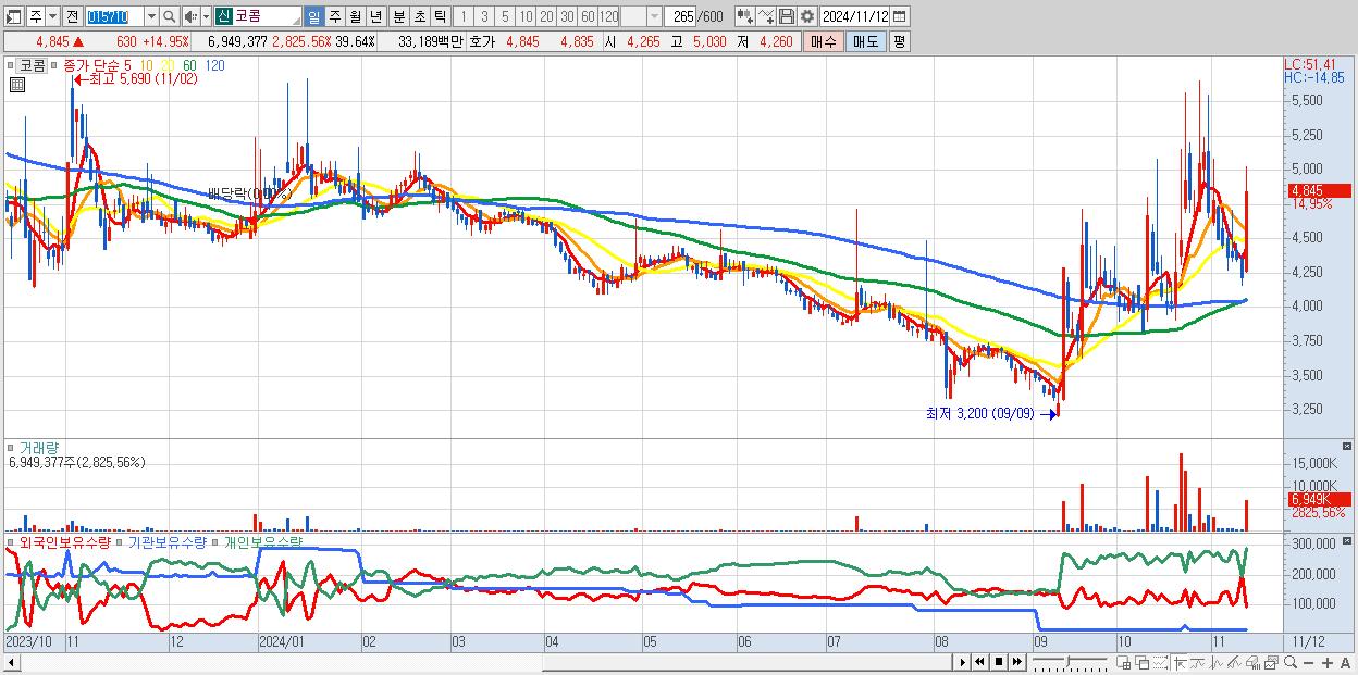 - 코콤 (4,845원 ▲ 14.95% , 시총: 849억, 거래량: 6,949,377, 거래대금:332억)