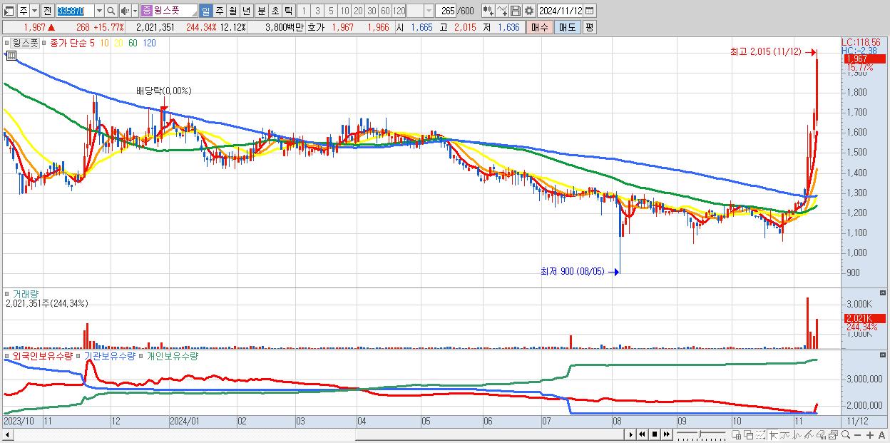 - 윙스풋 (1,967원 ▲ 15.77% , 시총: 328억, 거래량: 2,021,351, 거래대금:38억)