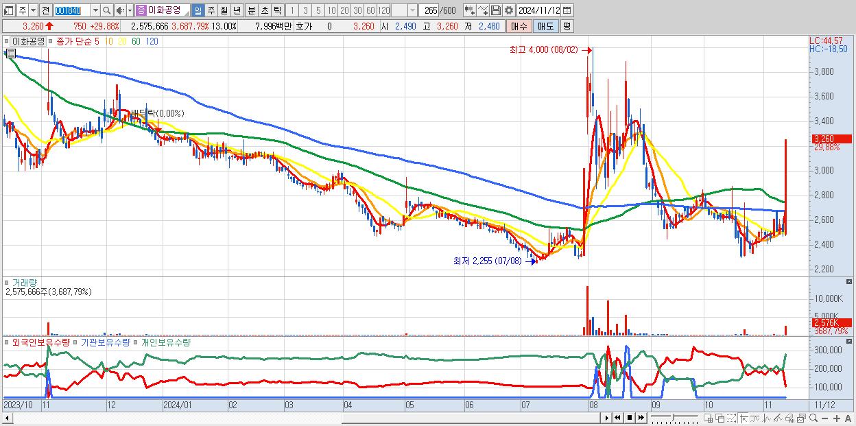 - 이화공영 (3,260원 ▲ 29.88% , 시총: 646억, 거래량: 2,575,666, 거래대금:80억)