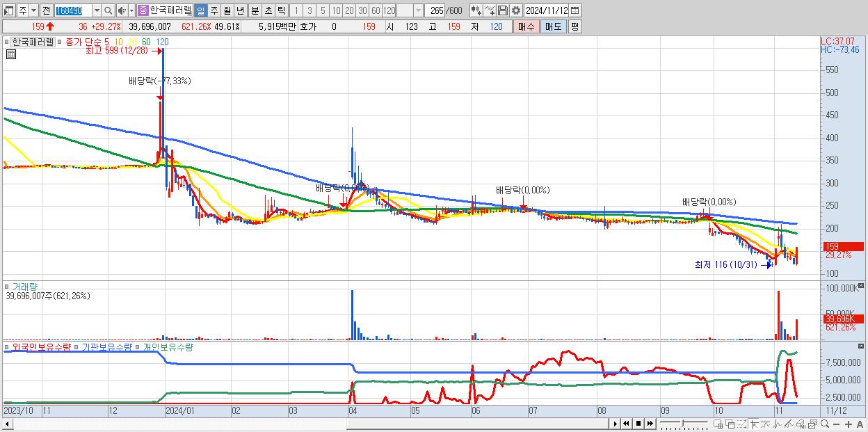 - 한국패러랠 (159원 ▲ 29.27% , 시총: 127억, 거래량: 39,696,007, 거래대금:59억)