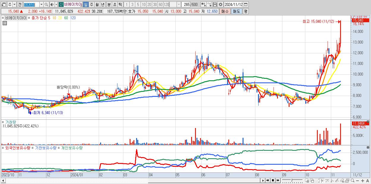 - 비에이치아이 (15,040원 ▲ 16.14% , 시총: 4,654억, 거래량: 11,845,829, 거래대금:1,677억)