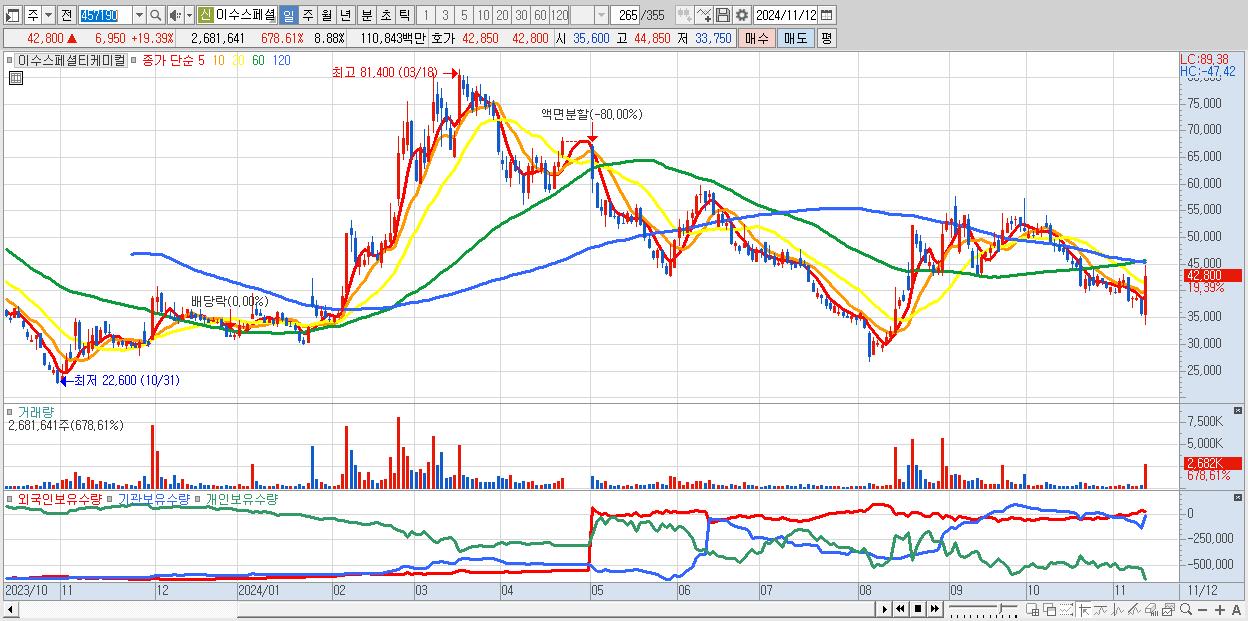 - 이수스페셜티케미컬 (42,800원 ▲ 19.39% , 시총: 12,929억, 거래량: 2,681,641, 거래대금:1,108억)