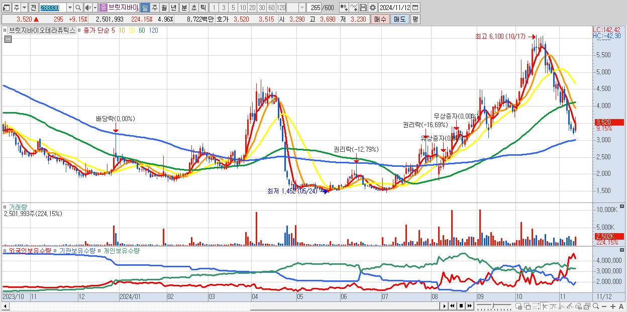 - 브릿지바이오테라퓨틱스 (3,520원 ▲ 9.15% , 시총: 1,774억, 거래량: 2,501,993, 거래대금:87억)