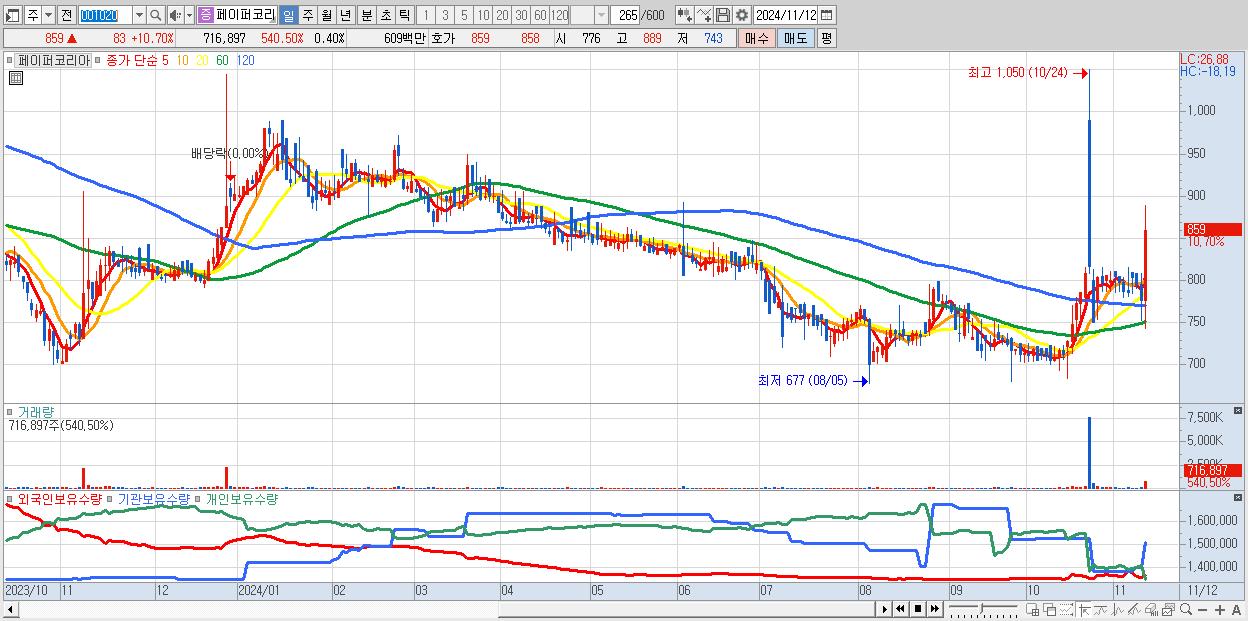 - 페이퍼코리아 (859원 ▲ 10.7% , 시총: 1,529억, 거래량: 716,897, 거래대금:6억)