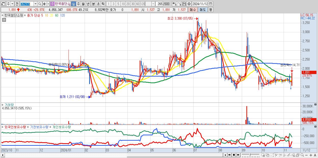 - 한국첨단소재 (1,891원 ▲ 29.97% , 시총: 187억, 거래량: 4,856,347, 거래대금:89억)
