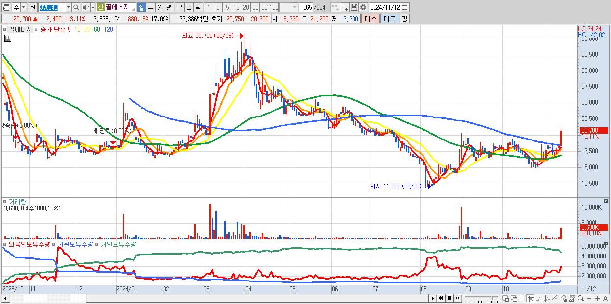 - 필에너지 (20,700원 ▲ 13.11% , 시총: 4,406억, 거래량: 3,638,104, 거래대금:734억)