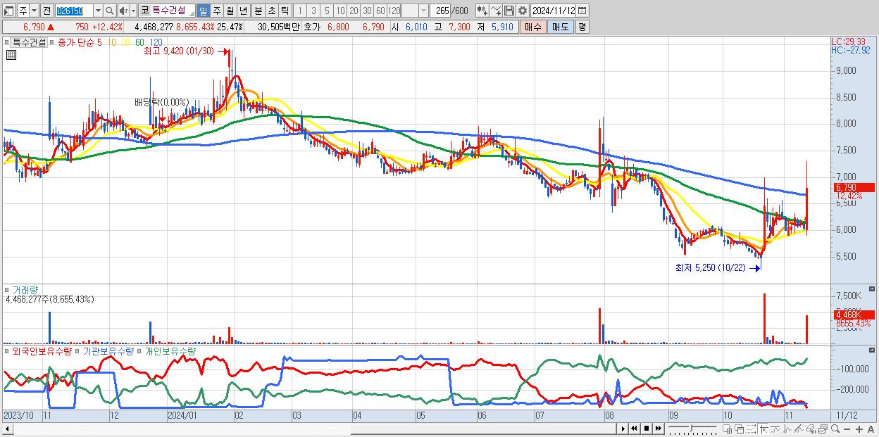 - 특수건설 (6,790원 ▲ 12.42% , 시총: 1,191억, 거래량: 4,468,277, 거래대금:305억)