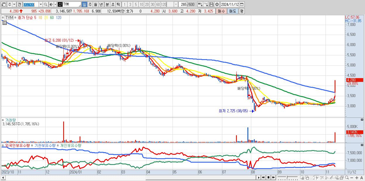 - TYM (4,280원 ▲ 29.89% , 시총: 1,928억, 거래량: 3,146,587, 거래대금:129억)