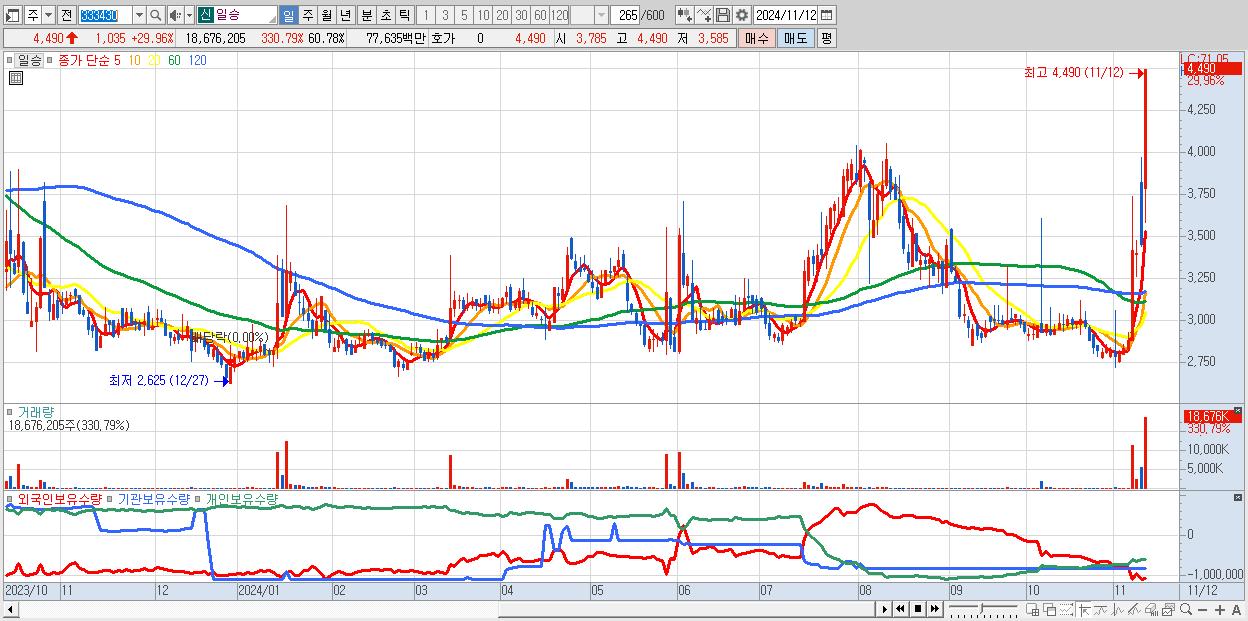 - 일승 (4,490원 ▲ 29.96% , 시총: 1,380억, 거래량: 18,676,205, 거래대금:776억)