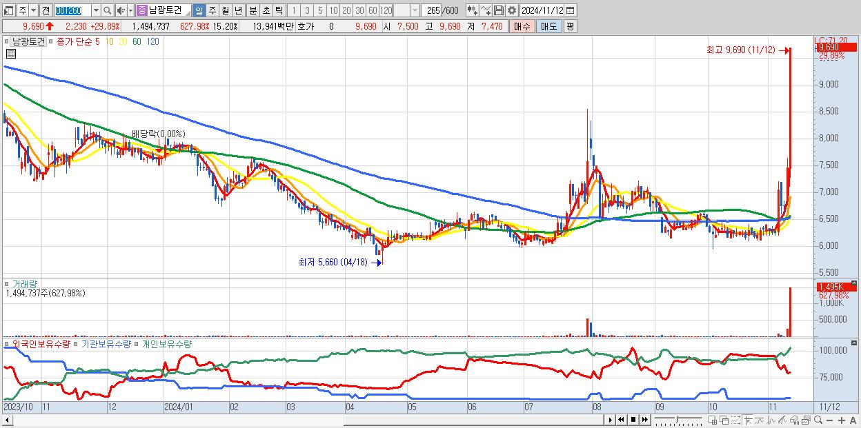 - 남광토건 (9,690원 ▲ 29.89% , 시총: 953억, 거래량: 1,494,737, 거래대금:139억)
