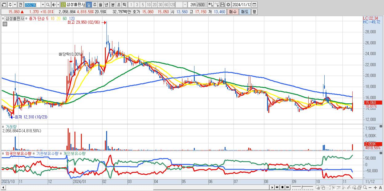 - 삼성출판사 (15,060원 ▲ 10.01% , 시총: 1,506억, 거래량: 2,058,884, 거래대금:328억)