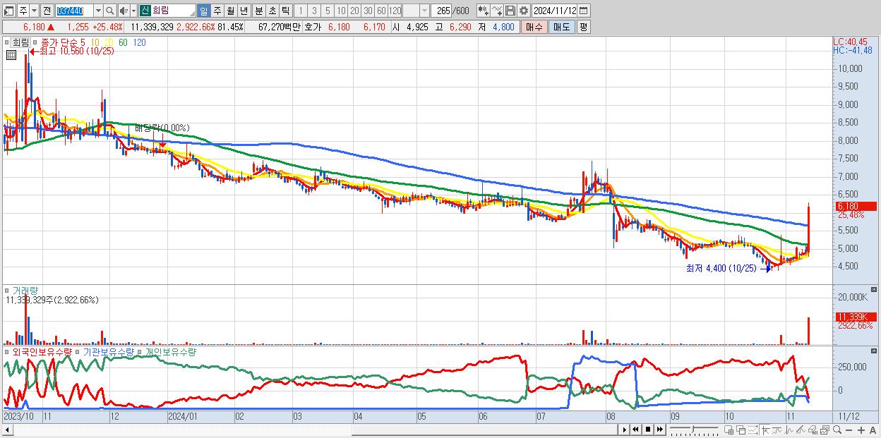 - 남화토건 (4,520원 ▲ 14% , 시총: 531억, 거래량: 2,177,685, 거래대금:98억)