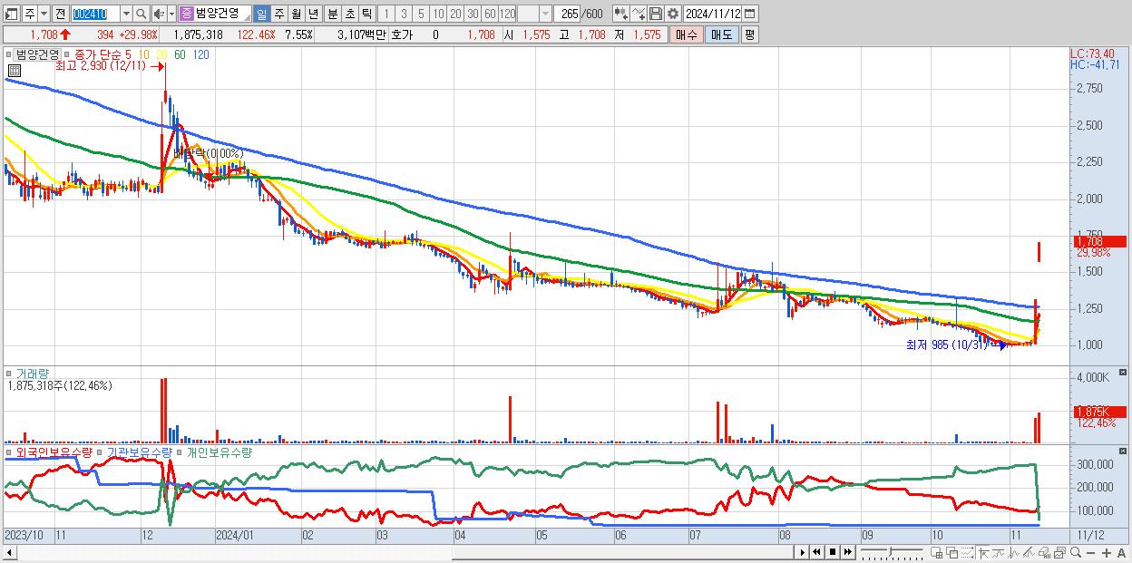 1.범양건영 1,708원 ▲ 29.98% (KOSPI, 002410)