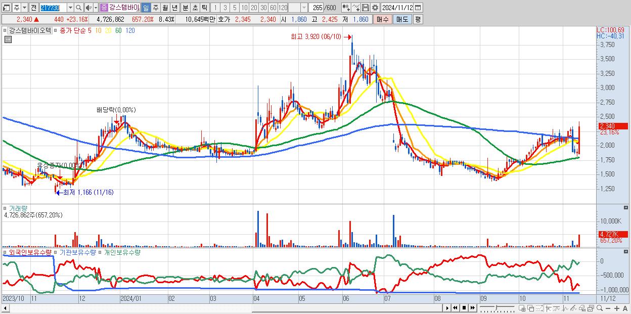 - 강스템바이오텍 (2,340원 ▲ 23.16% , 시총: 1,312억, 거래량: 4,726,862, 거래대금:106억)