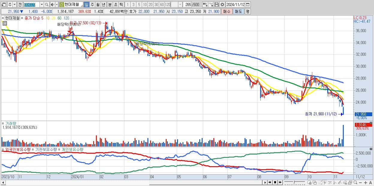 - 현대제철 (21,950원 ▼ -6% , 시총: 29,291억, 외국인 순매수 거래금:88억)