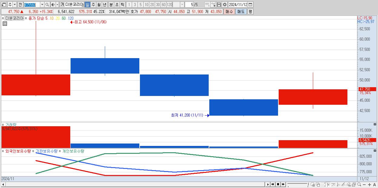 - 더본코리아 (47,750원 ▲ 15.34% , 시총: 6,908억, 거래량: 6,541,622, 거래대금:3,140억)