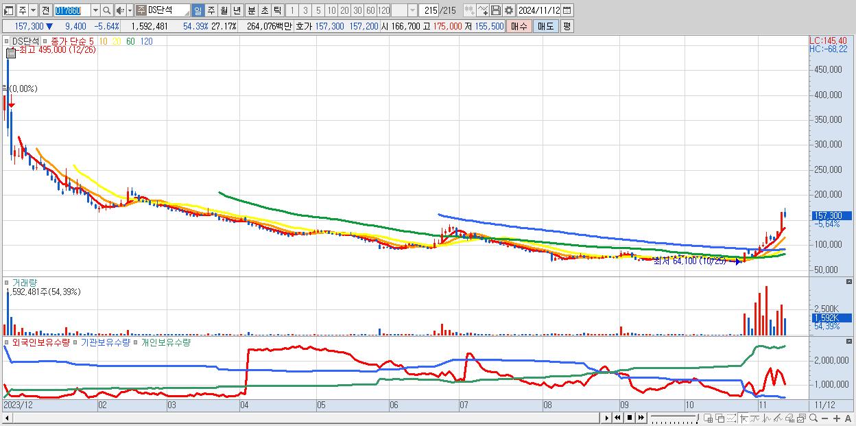 - DS단석 (157,300원 ▼ -5.64% , 시총: 9,220억, 거래량: 1,592,481, 거래대금:2,641억)