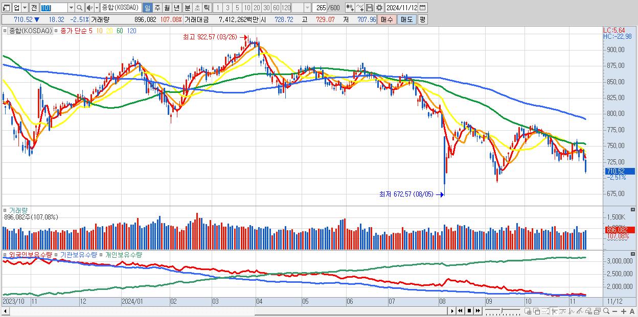 | 11/11 | 728.84 | ▼-1.96% | 855억 | -847억 | 43억 | -51억 |