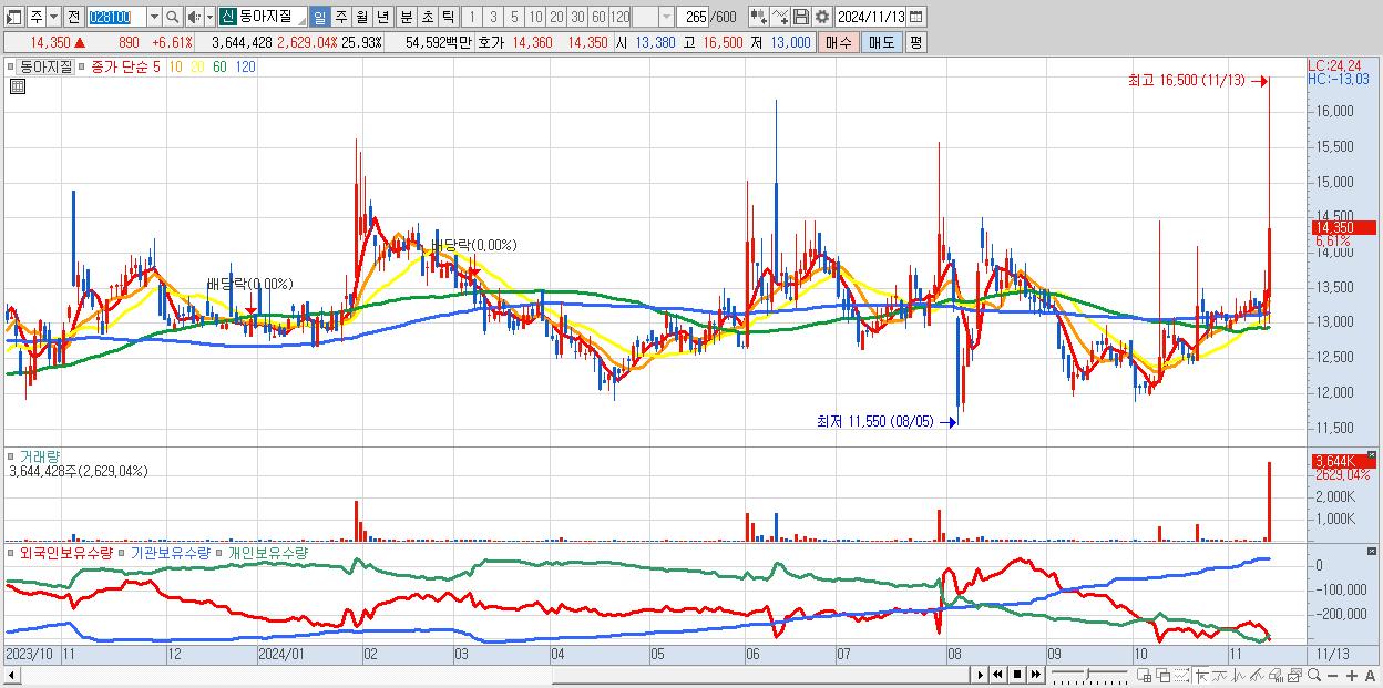 - 동아지질 (14,350원 ▲ 6.61% , 시총: 2,017억, 거래량: 3,644,428, 거래대금:546억)