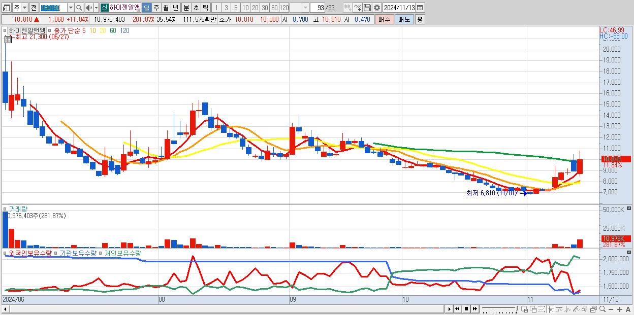 - 하이젠알앤엠 (10,010원 ▲ 11.84% , 시총: 3,092억, 거래량: 10,976,403, 거래대금:1,116억)