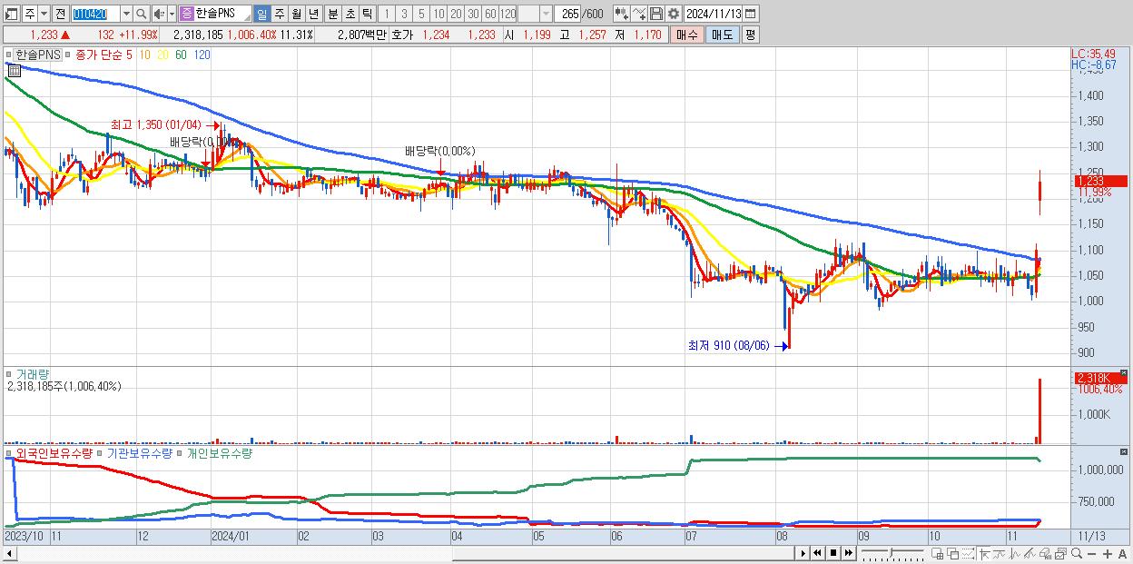 - 한솔PNS (1,233원 ▲ 11.99% , 시총: 253억, 거래량: 2,318,185, 거래대금:28억)