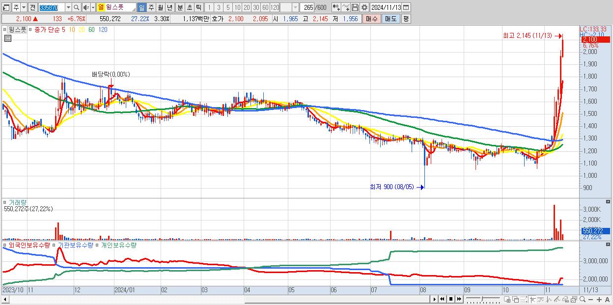 - 윙스풋 (2,100원 ▲ 6.76% , 시총: 350억, 거래량: 550,272, 거래대금:11억)