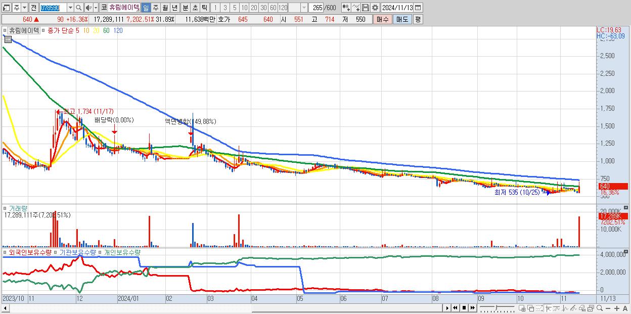 - 휴림에이텍 (640원 ▲ 16.36% , 시총: 347억, 거래량: 17,289,111, 거래대금:116억)