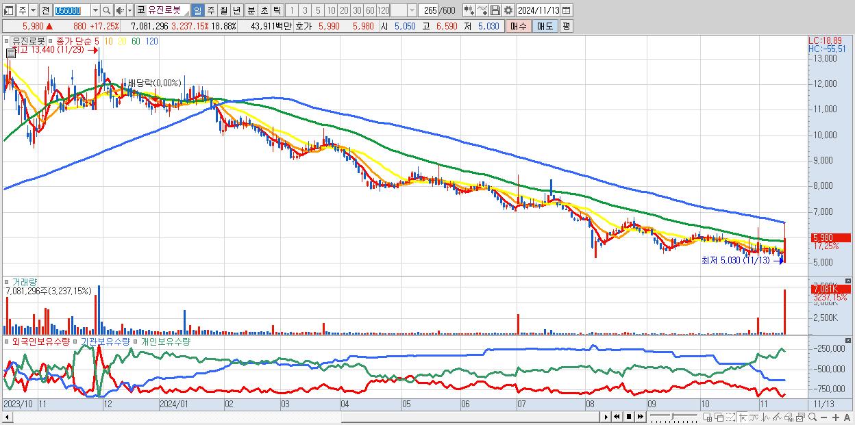 - 유진로봇 (5,980원 ▲ 17.25% , 시총: 2,243억, 거래량: 7,081,296, 거래대금:439억)
