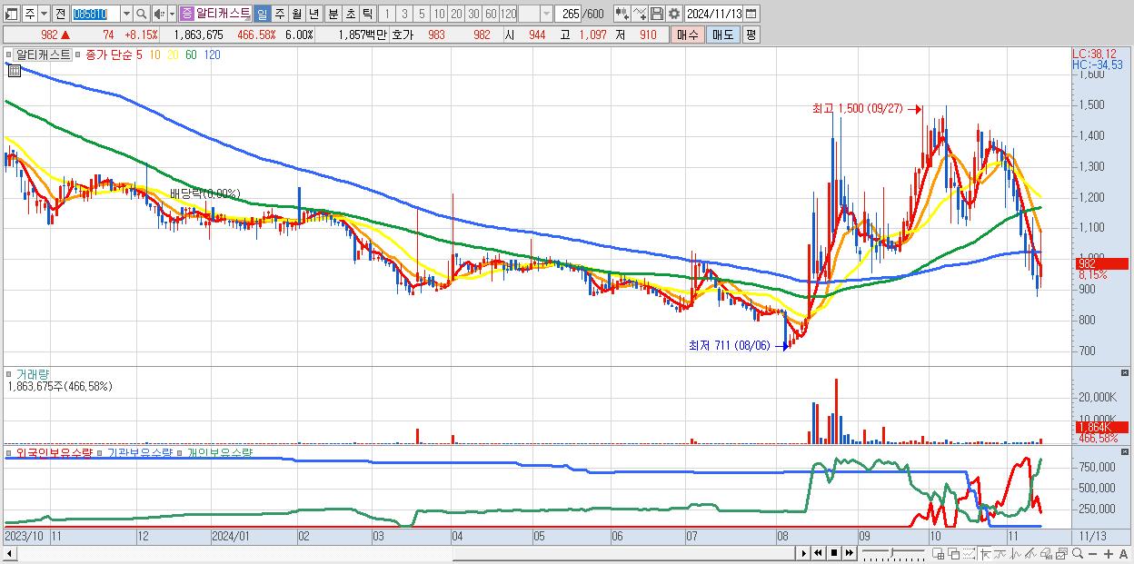 - 알티캐스트 (982원 ▲ 8.15% , 시총: 305억, 거래량: 1,863,675, 거래대금:19억)