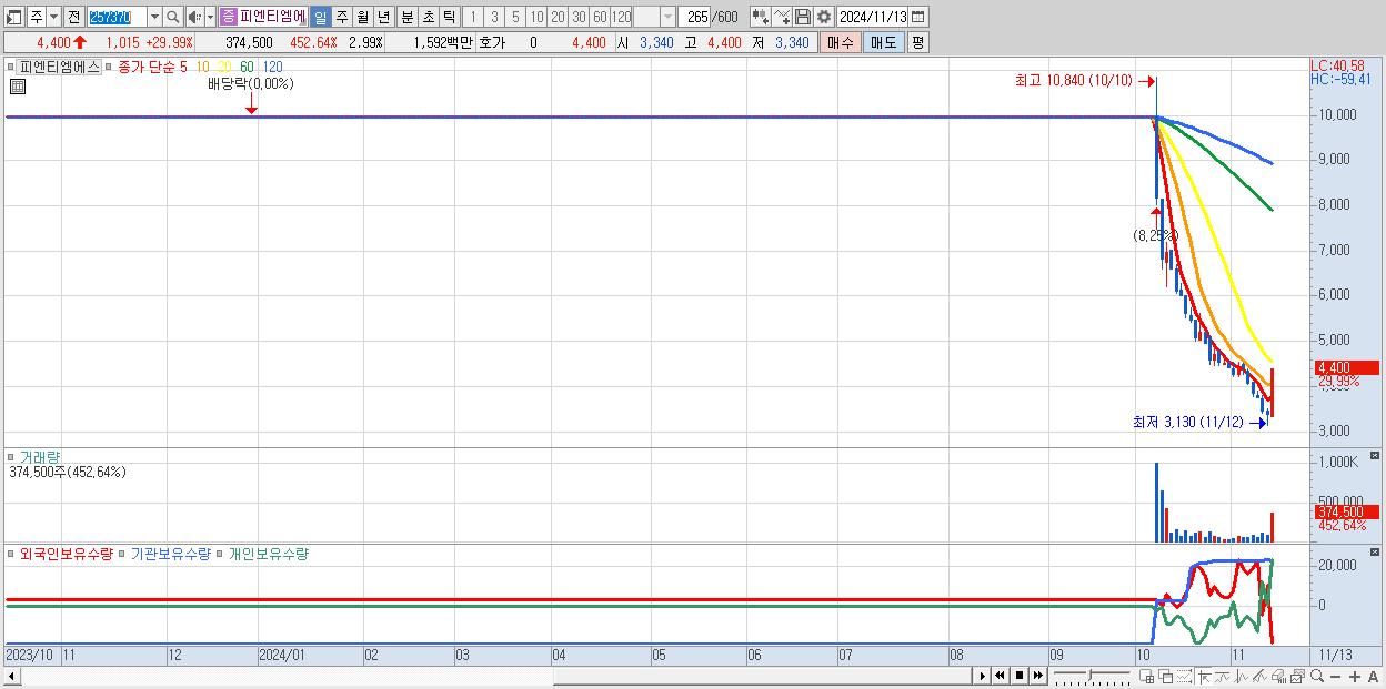 - 피엔티엠에스 (4,400원 ▲ 29.99% , 시총: 550억, 거래량: 374,500, 거래대금:16억)