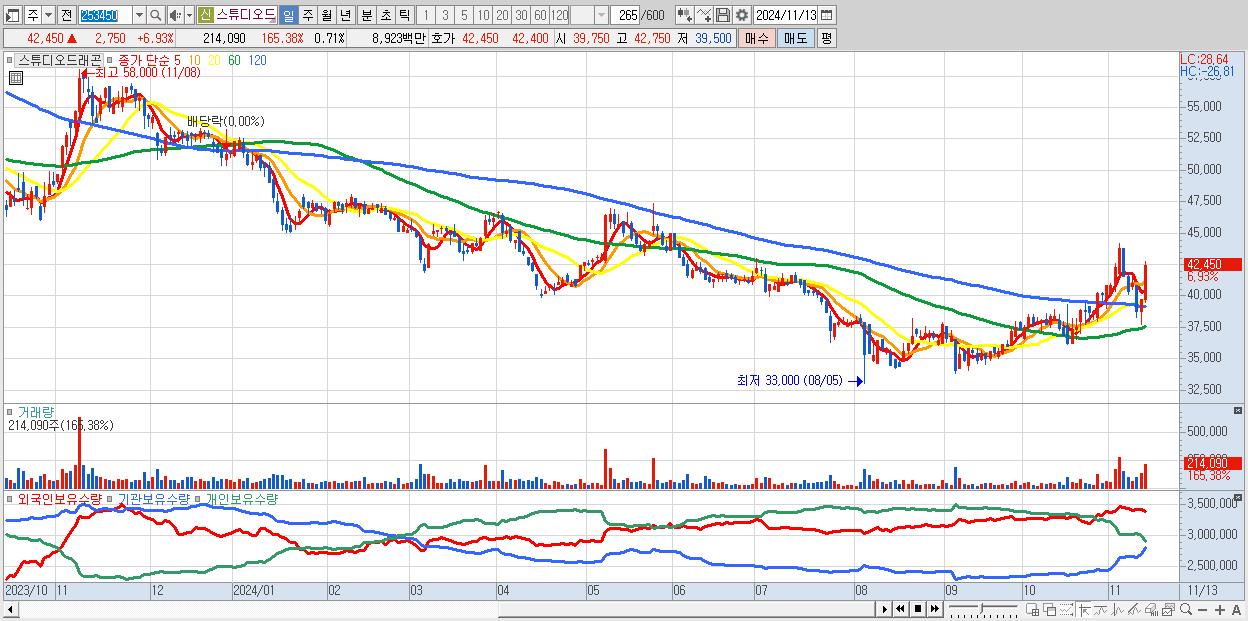 - 스튜디오드래곤 (42,450원 ▲ 6.93% , 시총: 12,760억, 거래량: 214,090, 거래대금:89억)